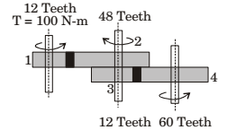 A frictionless gear train is shown in the figure. The left most 12-teeth gear is given a torque of 100 Nm. The output torque from the 60-teeth gear on the right in Nm is
