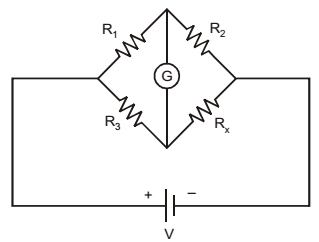 When the Wheatstone bridge shown is used to find value of resistance Rx, the Galvanometer G indicates zero current when R1 = 50Ω, R2 = 65Ω & R3 = 100Ω. If R3 is known with ± 5% tolerance on its nominal value of 100Ω, what is range of Rx in ohms?