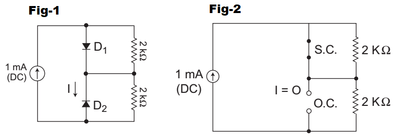 Diode D1 becomes forward biased due to short circuit and D2 becomes reverse biased due to open circuit which makes I = OmA.